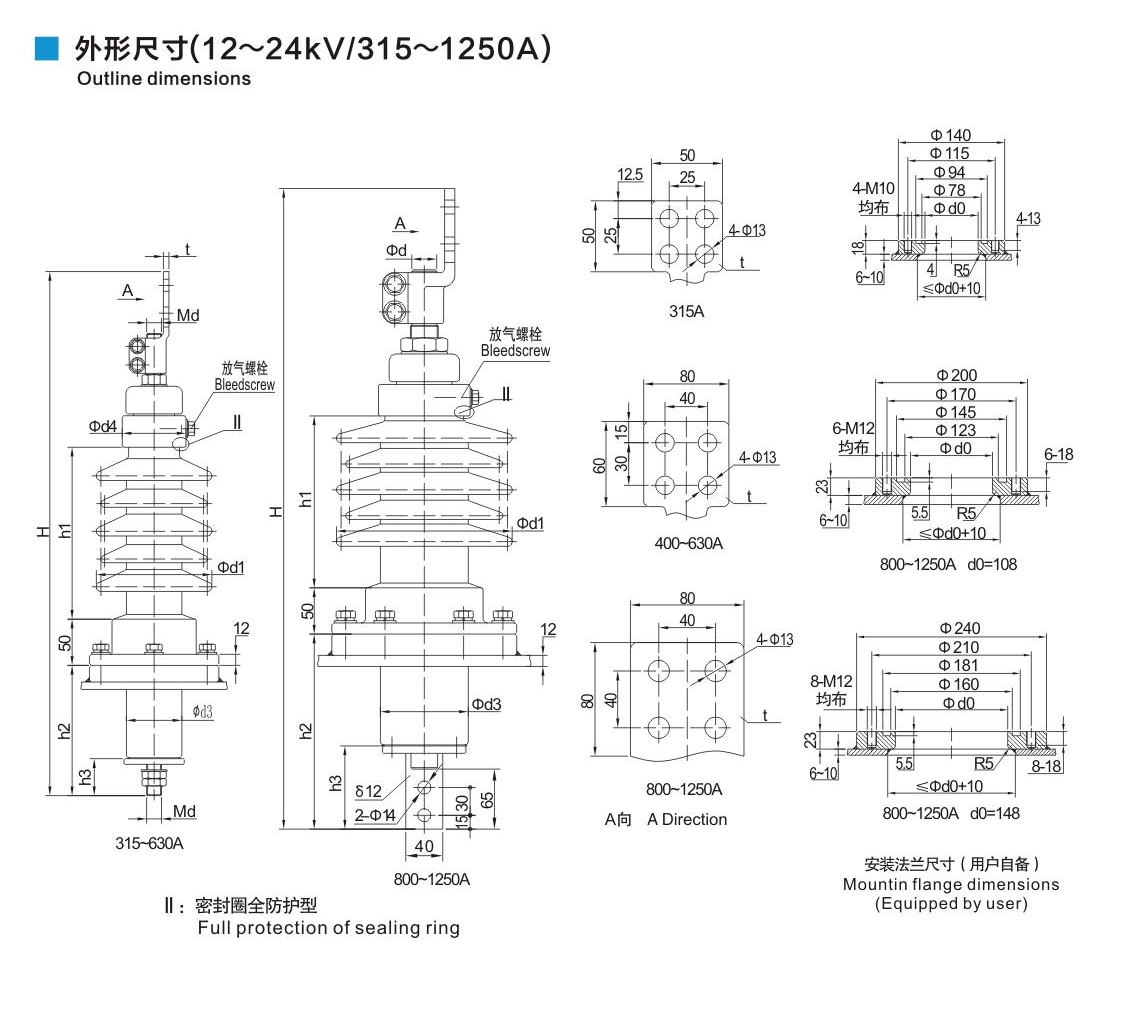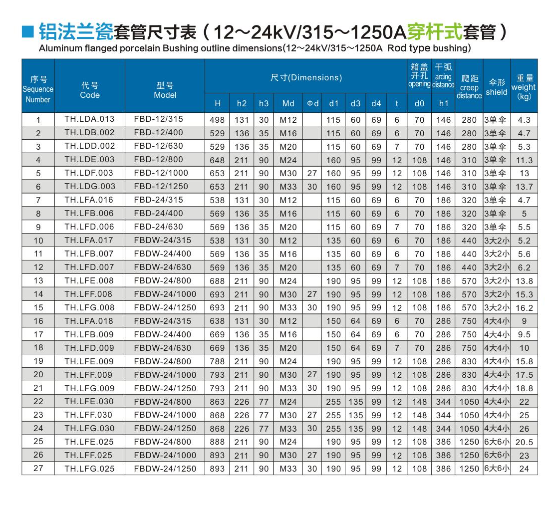 鋁法蘭瓷套管12~24kV/315~1250A穿桿式套管